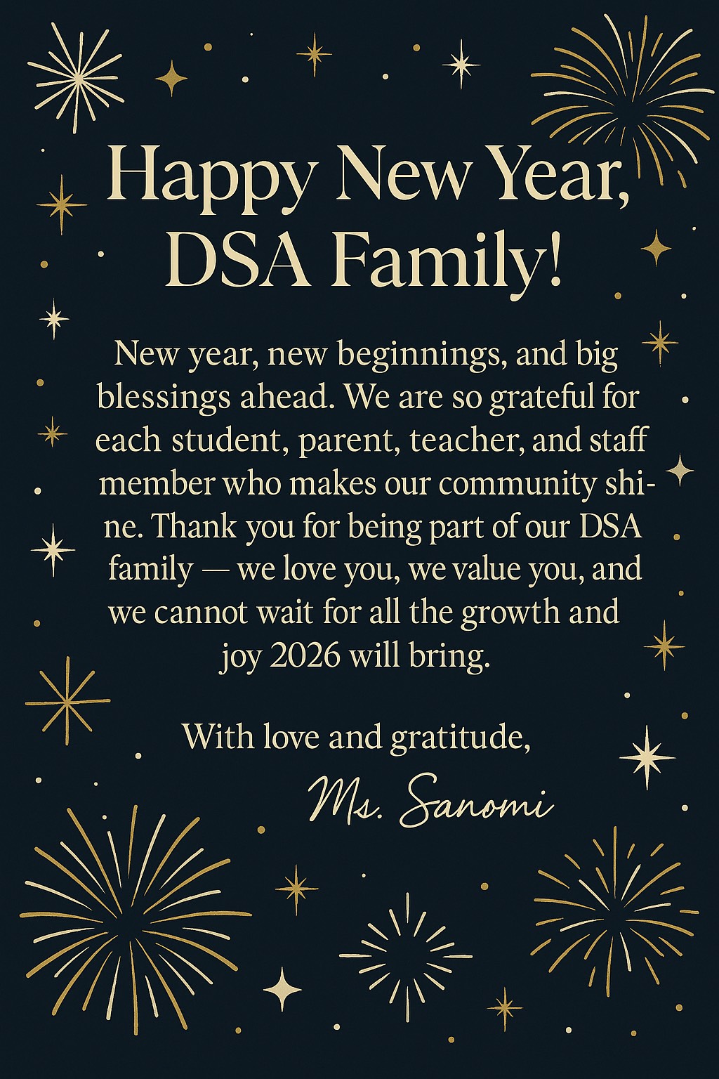 About About Our History Our Mission and Vision Meet the Team Join the Team Testimonials Brochure Admissions Admissions Admissions Process Tuition & Fees Apply Online Financial Aid Request a Tour Academics Academics Lower School Upper School NEST Program Student Services House Clubs Before & After School Care Program Student - Parent Handbook Uniform Purchase DSA Therapy and Health Services Support Cash App Paypal Donation Sponsorship Form News & Events News & Events Calendar DSA Events Calendar Family Portal Apply Online Student Portal Donate
